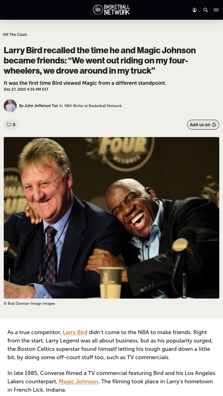 Ryan Lopez+FollowHow Larry Bird and Magic Johnson became friendsTurns out, one of basketball’s fiercest rivalries led to an unexpected friendship. When Larry Bird and Magic Johnson filmed a Converse commercial in Bird’s tiny hometown of French Lick, Indiana, they ended up bonding over four-wheelers, home-cooked meals, and Midwest roots. The best part? Bird’s own mom admitted Magic was her favorite player—even over her son! It’s wild to think that after years of epic battles on the court, a single day off the hardwood sparked a lifelong friendship. What do you think—can true rivals ever really become friends? #Sports #Basketball #NBA00Share