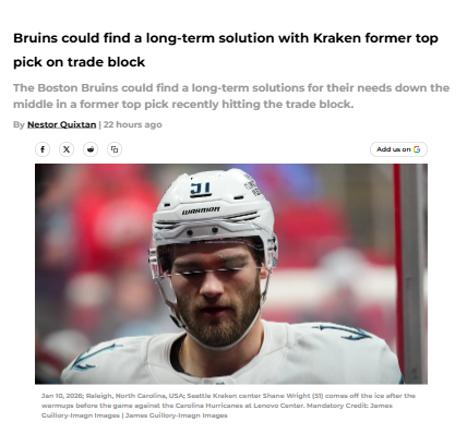 Martha Garza+FollowCould Shane Wright be Boston’s next big move?Boston’s hunt for a true top-line center might finally have a solution, and it’s not just a quick fix. With Seattle’s Shane Wright—once a top draft pick—now reportedly on the trade block, the Bruins have a rare shot at landing a long-term answer down the middle. Imagine Wright developing alongside Pastrnak, Zacha, and Lindholm, finally giving Boston the depth they’ve been missing. The big question: what would the Bruins have to give up, and is it worth the risk? Would you pull the trigger on a deal for Wright if you were Don Sweeney? #Sports #IceHockey #NHL00Share