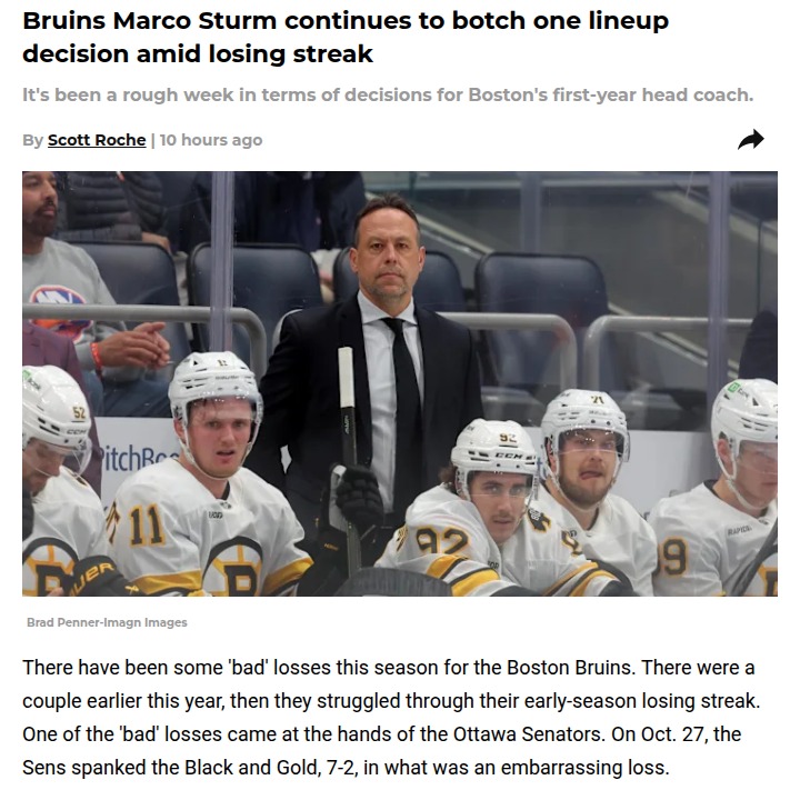 Jason Dawson+FollowBruins’ lineup choices raising eyebrowsBoston hockey fans are feeling the sting after another rough loss to Ottawa, and it’s hard not to notice Marco Sturm’s lineup decisions playing a big role. Swayman was run ragged with four straight starts, only to be pulled in for Korpisalo after a shaky performance. The result? Another blowout and a lot of frustrated fans. With a tough stretch ahead, it’s fair to wonder if a different approach in goal could have changed the momentum. What do you think—should Sturm shake up his strategy or stick to his guns? #Sports #IceHockey #NHL00Share