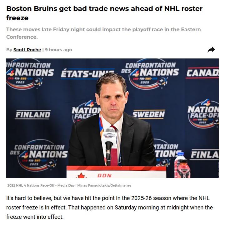 William Morrow+FollowBruins miss out as rivals make big movesJust before the NHL roster freeze kicked in, the Canadiens and Blue Jackets pulled off some bold trades to shake up the Eastern Conference playoff race. Montreal brought back Phillip Danault, hoping he’ll spark their offense, while Columbus grabbed Mason Marchment—one of the names many thought the Bruins might target. With the standings tighter than ever, these last-minute deals could make a real difference. Now, the Bruins are left watching as other teams get stronger. Do you think Boston should have made a move, or is patience the right play? #Sports #IceHockey #NHL00Share