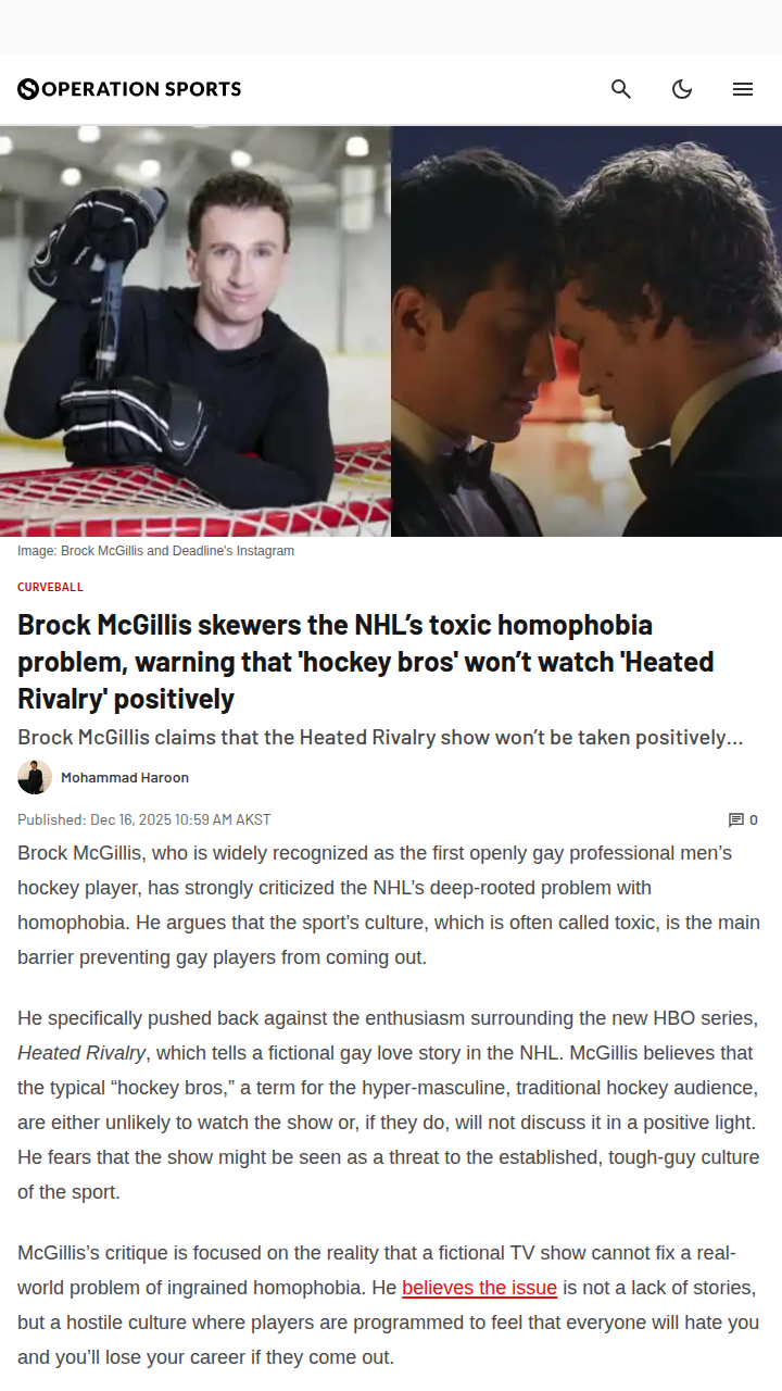 Molly Tucker+FollowIs Heated Rivalry Changing Hockey Culture?Brock McGillis, the trailblazing former pro, just called out the NHL’s toxic locker room culture after HBO’s Heated Rivalry dropped. While the show’s got fans buzzing about Shane and Ilya’s secret romance, McGillis says the real “hockey bros” aren’t ready to embrace it—or talk about it honestly. He’s skeptical that a TV drama can break down decades of homophobia, but hopes it sparks support from friends and family. What do you think—can a show really shift the ice? #Sports #IceHockey #NHL00Share