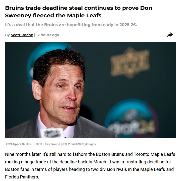 Bryce Clark+FollowBruins vs Leafs: Minten Trade Paying OffNine months after Don Sweeney's bold deadline move, it's clear the Bruins came out on top in the Carlo-for-Minten swap with the Leafs. While Toronto's D-core took a hit with Carlo sidelined and swirling in trade rumors, Boston's newest young gun, Fraser Minten, is thriving alongside Pasta and making a real impact. This deal is shaping up to be a classic rivalry moment that fans will debate for years! #Sports #IceHockey #NHL00Share