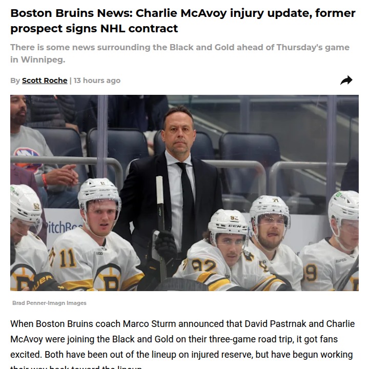 Jason Dawson+FollowBruins fans buzzing: McAvoy’s return loomsCharlie McAvoy skating and leading stretches at practice has Bruins fans hopeful he’ll be back in the lineup soon—maybe even against the Jets. With David Pastrnak already back and racking up three assists in the win over the Blues, Boston’s getting healthy at just the right time. Meanwhile, Nikita Zadorov’s big hits continue to make waves, sidelining another opponent. Plus, former Bruins prospect Trevor Kuntar just signed an NHL deal with the Sabres after grinding it out in the AHL. How do you feel about Boston’s playoff push with key players returning? #Sports #IceHockey #NHL00Share