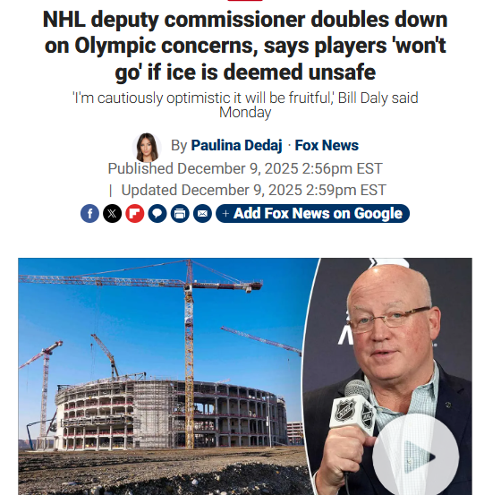 William Morrow+FollowWill NHL Stars Miss Milan 2026?Big news out of the NHL Board of Governors meeting: Deputy Commish Bill Daly is holding firm—if the Milan Olympic rink isn’t up to snuff, the league’s top guns like McDavid and Sid the Kid won’t lace up for Team Canada or USA. The league’s sending in their ice gurus, but if the surface isn’t safe, it’s game over for NHLers at the Games. Is this a power play or just smart safety? Let’s hear your take! #Sports #IceHockey #NHL10Share