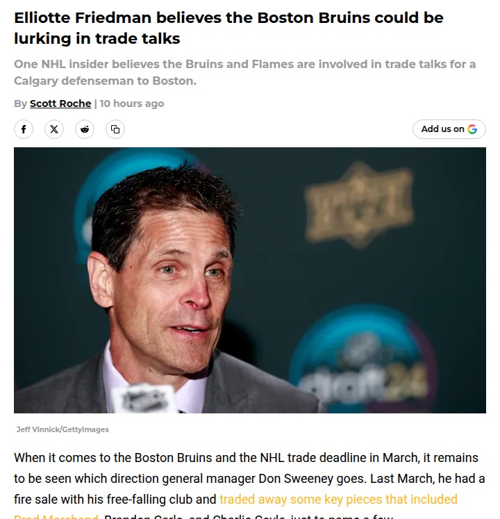 david52+FollowBruins eye Flames’ Andersson before trade deadlineBoston hockey fans, things could get spicy before the trade deadline! NHL insider Elliotte Friedman says the Bruins are seriously interested in Calgary’s Rasmus Andersson—a move that could reshape Boston’s defense. With the team needing a strong blueliner, a center, and a scoring wing, Andersson checks a big box. But the price won’t be cheap, and there’s a push to get any deal done before the Olympic break. If GM Don Sweeney pulls this off, it could signal a major shift for the Bruins’ playoff hopes. What do you think—should Boston go all-in for Andersson? #Sports #IceHockey #NHLTradeDeadline00Share