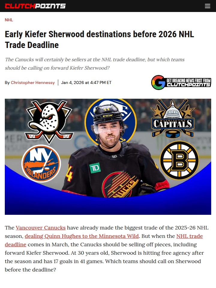 Jordan Leblanc+FollowSherwood Reunion in Anaheim? Ducks Eye Scoring BoostWith the Canucks in full rebuild mode after sending Captain Clutch (Quinn Hughes) to the Wild, all eyes are on Kiefer Sherwood as the next big trade chip. The Ducks, hungry for playoff depth and coached by Quenneville, could bring Sherwood back to SoCal, especially with Mintyukov in the mix. Would a return spark Sherwood’s best hockey yet? Or do the Isles or Bruins outbid Anaheim for his scoring touch? Let’s hear your trade packages! #Sports #IceHockey #NHLTradeDeadline00Share