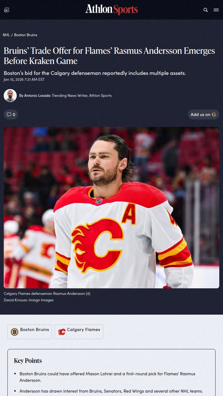 stacy28+FollowBruins vs. Golden Knights: Andersson Trade BattleBruins fans, get ready for a trade showdown! Boston is in a heated race with the big-money Golden Knights to land Flames blueliner Rasmus Andersson. With the B’s looking to shore up their D for a playoff push, Andersson’s name is all over the rumor mill. Can Pasta and the crew outmaneuver Vegas’ deep pockets and add a two-way workhorse to the blue line? This could be a game-changer for either squad! #Sports #IceHockey #NHLTradeRumors00Share
