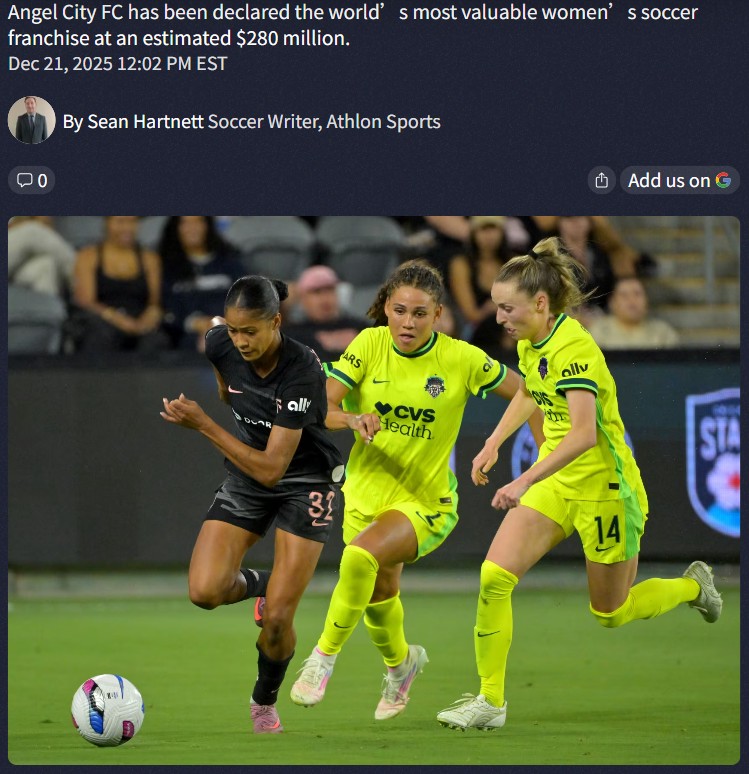 Jamie Mack+FollowAngel City FC & KC Current: NWSL Power Shift?Forbes just dropped its 2025 list of most valuable women’s sports franchises, and NWSL fans have a lot to brag about! Angel City FC leads all women’s soccer teams globally at $280M, even without playoff success. But the real flex? Kansas City Current, co-owned by Brittany & Patrick Mahomes, shattered NWSL records this season—most wins, points, and shutouts. Is the NWSL’s rise changing the women’s sports landscape for good? #Sports #Soccer #NWSL00Share
