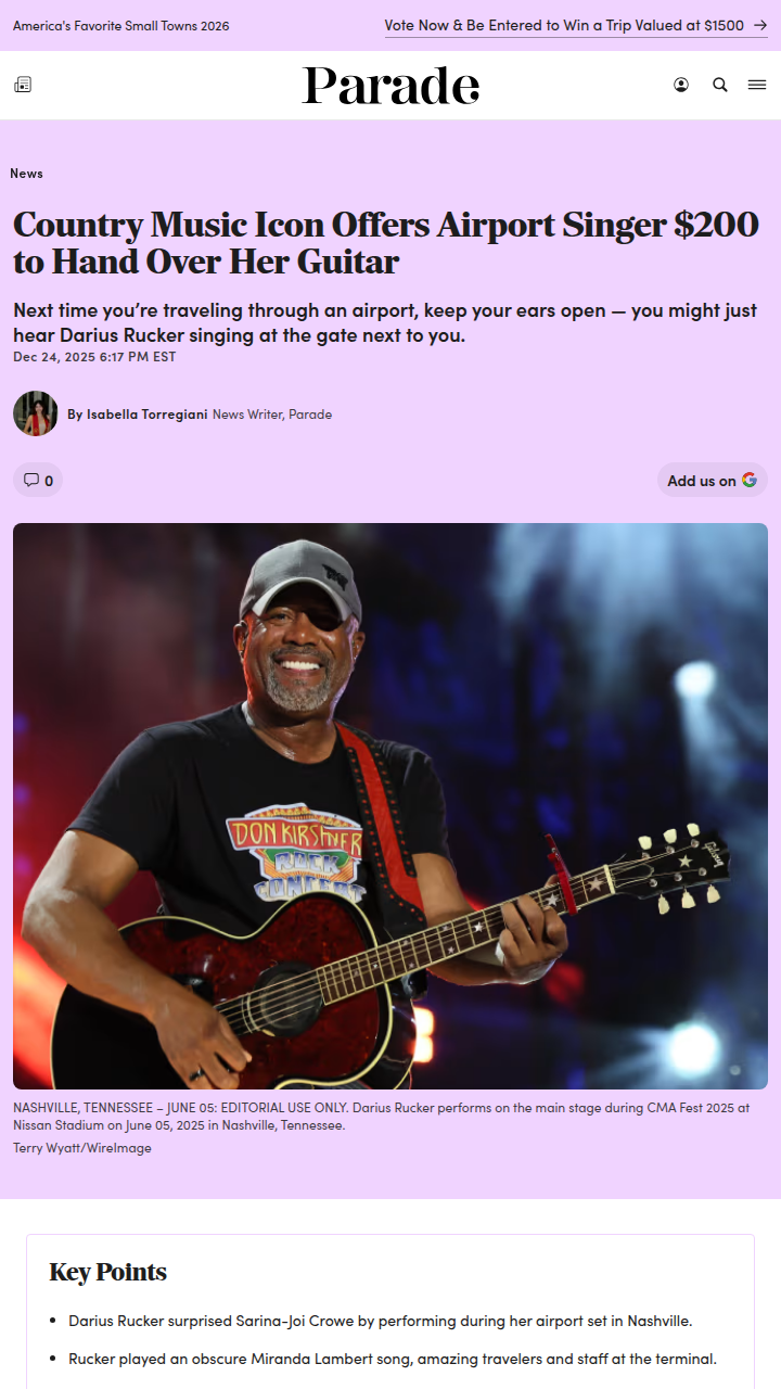 Savannah Smith+FollowDarius Rucker surprises Nashville airport crowdHoliday travel at Nashville International just got a lot more memorable for a lucky few. Imagine grabbing a drink at the airport bar and suddenly hearing Darius Rucker—yes, the Hootie & the Blowfish legend—borrowing a guitar and covering Miranda Lambert right in front of you. Most travelers didn’t even realize who was serenading them! It’s the kind of only-in-Nashville moment that makes the chaos of holiday flights a little brighter. If you’d been there, would you have recognized him? Or would you have just enjoyed the music and the story to tell? #Entertainment #Nashville #DariusRucker00Share