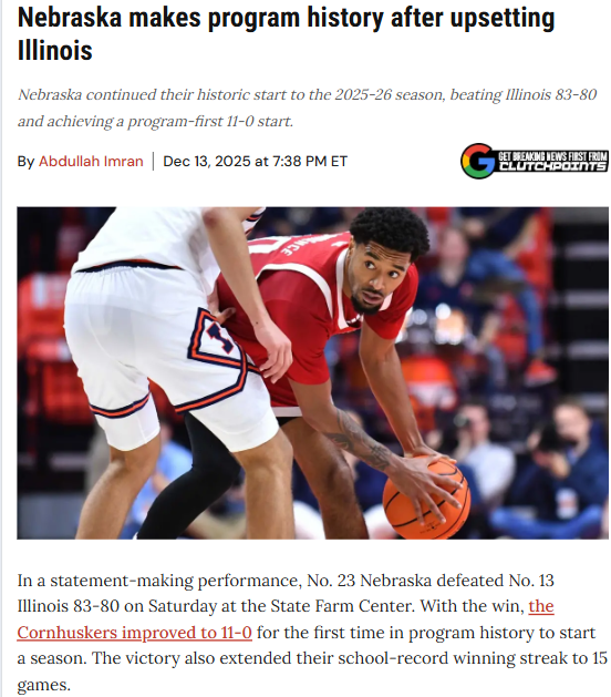 CrimsonChameleon+FollowNebraska stuns Illinois with historic buzzer-beaterJamarques Lawrence’s clutch 3-pointer with less than a second left just gave Nebraska basketball fans a moment to remember—an 83-80 win over Illinois and the best start in program history! The Huskers are now 11-0, surpassing their legendary 1977-78 run. Pryce Sandfort was on fire, dropping a career-high 32 points, and the team has now won 15 straight games dating back to last season. Nebraska’s first road win this year also snapped Illinois’ six-game home streak against them. How far do you think this Huskers team can go? #Sports #NebraskaBasketball #Huskers00Share