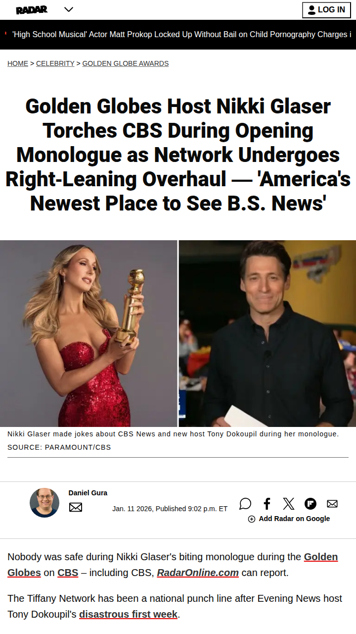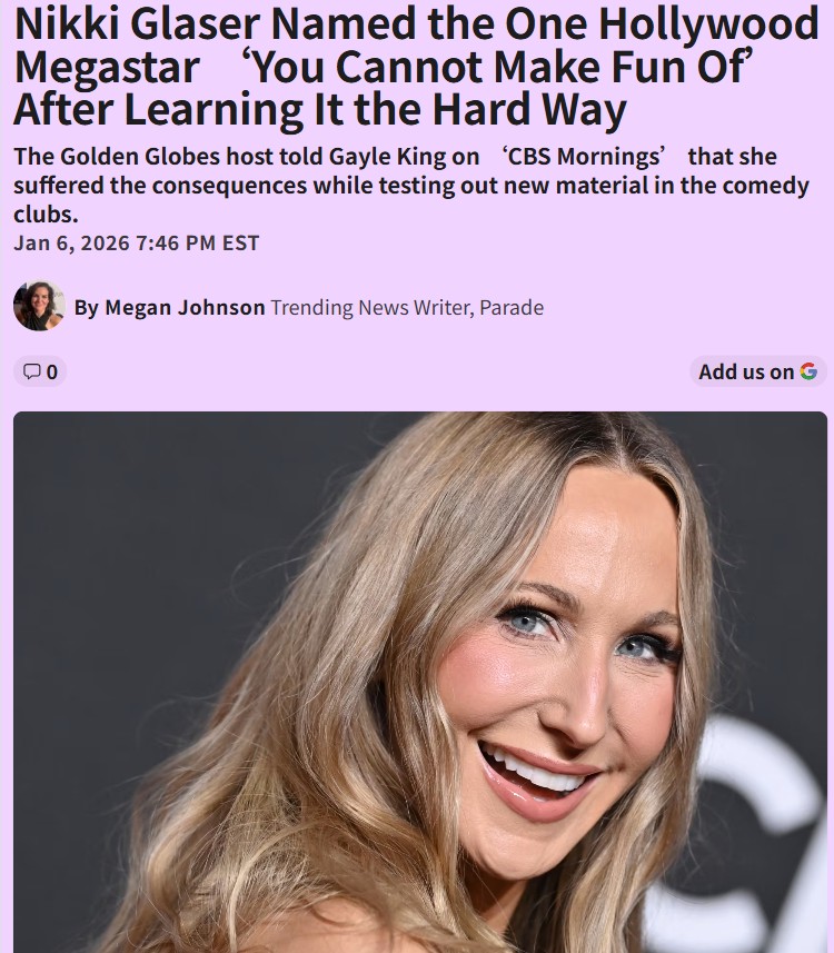 georgebryant+FollowNikki Glaser Roasts CBS Live 😂Did anyone else catch Nikki Glaser absolutely torching CBS during her Golden Globes monologue? She didn’t just go after the celebs—she called out her own network for 'B.S. news' right on their stage! Fans are split: some say she’s iconic for calling out the network, others think it’s risky with CBS already struggling after Dokoupil’s rough debut. Is this the boldest awards show moment in years or just career suicide? #Entertainment #TVSeries #NikkiGlaser20Share