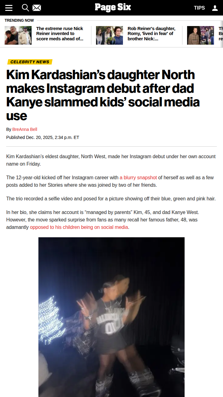 Meghan Reynolds+FollowNorth West’s IG Debut: Parenting or Risk?North West just dropped her first personal Instagram post at age 12, and the internet is buzzing. With her parents split on the idea—Kim supporting creative freedom, Kanye worried about online exposure—this move spotlights the tension between digital expression and child safety. Are we witnessing a new era of celebrity kid influencers, or are the risks too high? Where do you stand on kids and social media? #Tech #NorthWest #SocialMediaDebate00Share