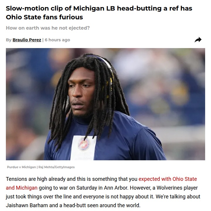 Chad Williams+FollowOhio State fans outraged after Michigan player head-butts refThat moment when Michigan linebacker Jaishawn Barham lowered his helmet and made contact with a ref after the whistle has Ohio State fans seeing red. In a rivalry already packed with tension, this unsportsmanlike move crossed a line for many. Barham only got flagged—not ejected—which left Buckeye supporters and even some neutral fans stunned. People are debating if the officials should have acted more decisively, especially with so much on the line. Should a head-butt to an official ever be just a penalty? Let’s hear your take on how this impacts the rivalry and the game’s integrity. #Sports #Football #OhioStatevsMichigan00Share