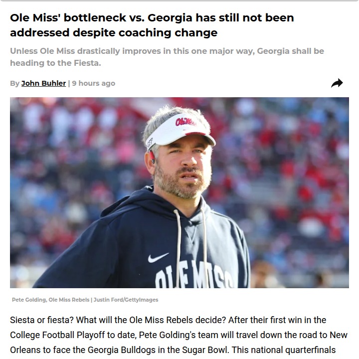Bruce Johnson+FollowGolding Era: Rebels Ready for Dawgs RematchHotty Toddy, Rebel fans! After Pete Golding’s debut blowout over Tulane, Vegas is showing real respect—Ole Miss is just a 6.5-point underdog against the Dawgs. That’s tighter than Bama or Miami got! With King Lane gone but Charlie Weis Jr. still calling plays, the offense looks sharp. Can Golding’s crew finally finish the job and avenge that wild Georgia comeback? This Sugar Bowl rematch could be legendary! #Sports #OleMiss #GeorgiaBulldogs00Share