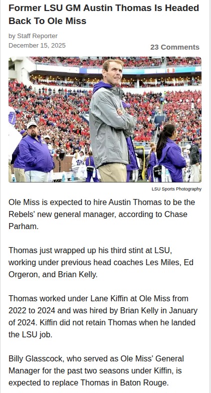 Judith Nelson+FollowRebels Welcome Back Austin Thomas!Big news for Rebel Nation—Austin Thomas is returning to Ole Miss as the new GM! After a wild ride with the Bayou Bengals, working under legends like Les Miles and Coach O, Thomas is back with Lane Train. The GM swap with Billy Glasscock heading to LSU just adds more fuel to the SEC rivalry fire. Thoughts on how this move will shake up recruiting battles? #Sports #OleMiss #LSU00Share