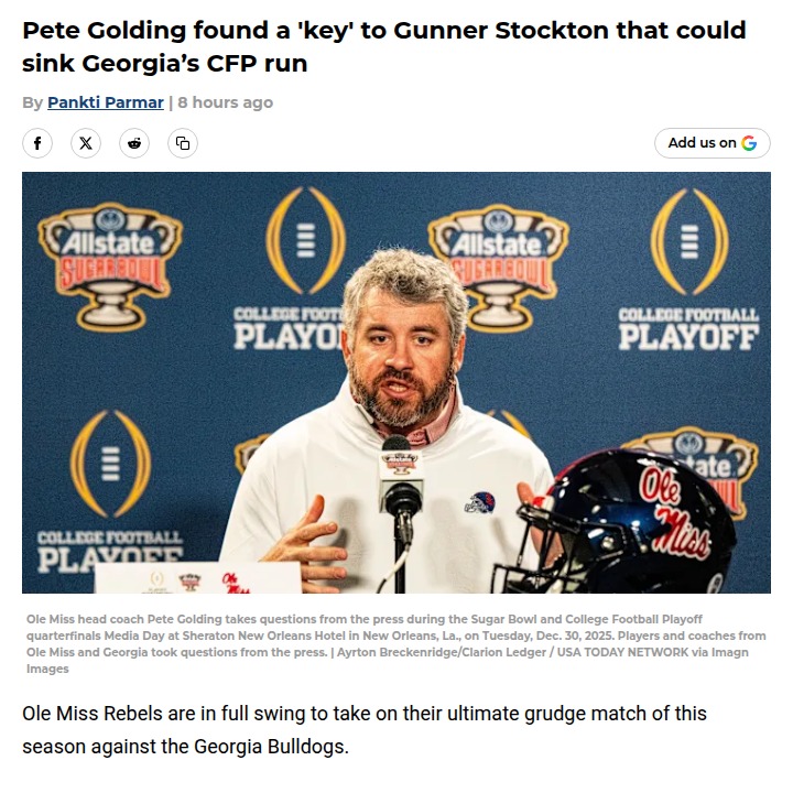 Aaron Taylor+FollowCan the Rebels Crack Georgia’s CFP Code?The Rebels are gearing up for their biggest grudge match yet against the Dawgs, and Pete Golding just dropped some serious insight on how they plan to stop Gunner Stockton. Golding’s game plan? Force Stockton to stay in the pocket and beat them with his arm, not his legs. If the Landsharks can keep Georgia from racking up big plays early, we might just see a CFP-shaking upset. Thoughts on Golding’s strategy? #Sports #Football #OleMiss00Share