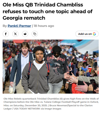 John Camacho+FollowOle Miss QB's silence fuels transfer buzzTrinidad Chambliss is keeping quiet about Lane Kiffin, and it’s got everyone talking. With the transfer portal about to open and his sixth-year waiver still up in the air, Chambliss is dodging any talk that could land him in NCAA hot water. The real twist? If his waiver is approved, he could jump ship and reunite with Kiffin at LSU—setting up a wild offseason storyline. For now, his focus is on the Georgia rematch, but the uncertainty has fans buzzing. How do you feel about players navigating these transfer rules and media silence? #Sports #Football #OleMiss00Share