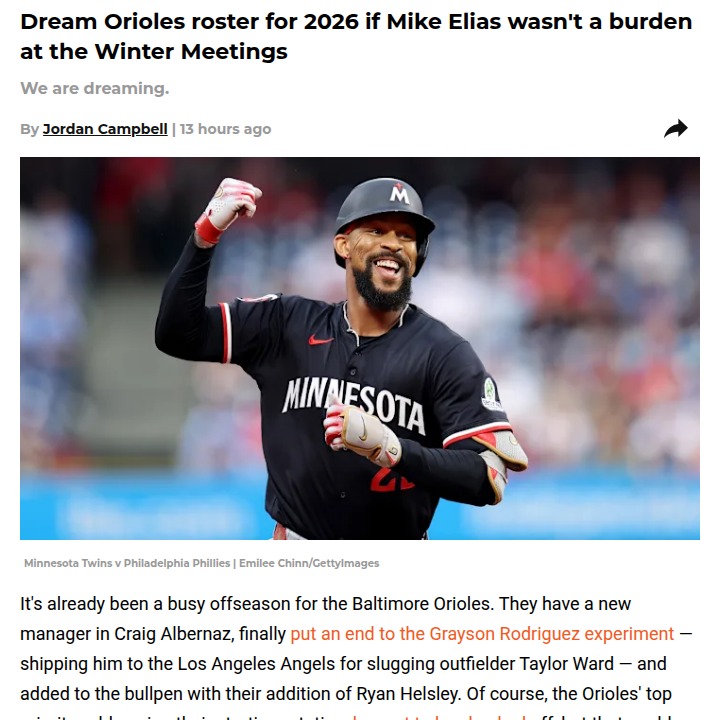 Timothy Huff MD+FollowOrioles fans: Imagine this 2026 dream teamPicture the Orioles in 2026 with a powerhouse lineup—Freddy Peralta, Michael King, and Zac Gallen anchoring the rotation, Pete Alonso and Alex Bregman bringing thunder to the infield, and Byron Buxton patrolling center field. Mike Elias has made some bold moves this offseason, but what if he went all-in at the Winter Meetings? With the right trades and signings, Baltimore could finally have the complete roster fans have been craving. Which dream addition would make the biggest impact, and what risks would you take to see the O’s become true contenders? #Sports #Baseball #Orioles01Share