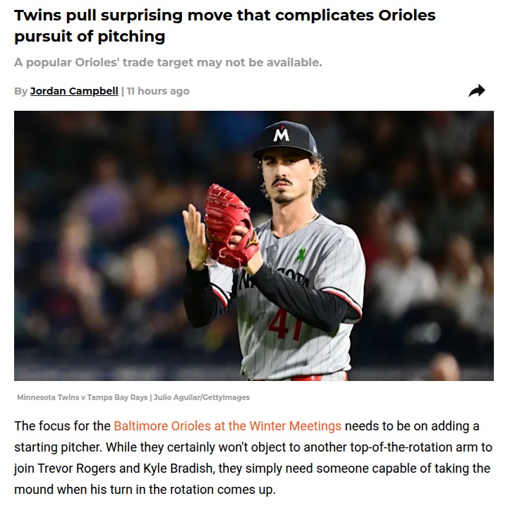 Timothy Huff MD+FollowOrioles face new twist in pitching chaseThe Orioles’ hunt for a reliable starting pitcher just got trickier—word is the Twins might hold onto Joe Ryan, despite earlier trade buzz. This move could force Baltimore to rethink their options, even though they’ve got the cash and prospects to make a splash. The rumor mill suggests the Twins’ hesitation might be a strategy to drive up offers, or maybe they’re just not ready to let go. With the Winter Meetings coming up, anything can still happen. Orioles fans, what’s your take—should the team push harder for Ryan, or pivot to other arms? #Sports #Baseball #Orioles11Share