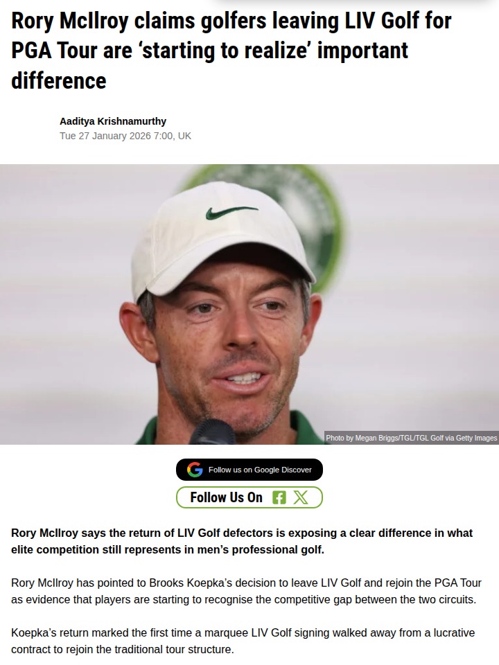Gabriella Gonzalez+FollowKoepka’s PGA Tour Return: Real Competition WinsBig news in the golf world: Brooks Koepka is back on the PGA Tour, and Rory “Rors” McIlroy isn’t shy about what it means. Rors says Koepka’s move shows the real draw of elite competition—something LIV Golf just can’t match. With Koepka giving up big perks to return, McIlroy frames it as a legacy-over-money play. Do you think more LIV stars will follow? #Sports #Golf #PGATour00Share