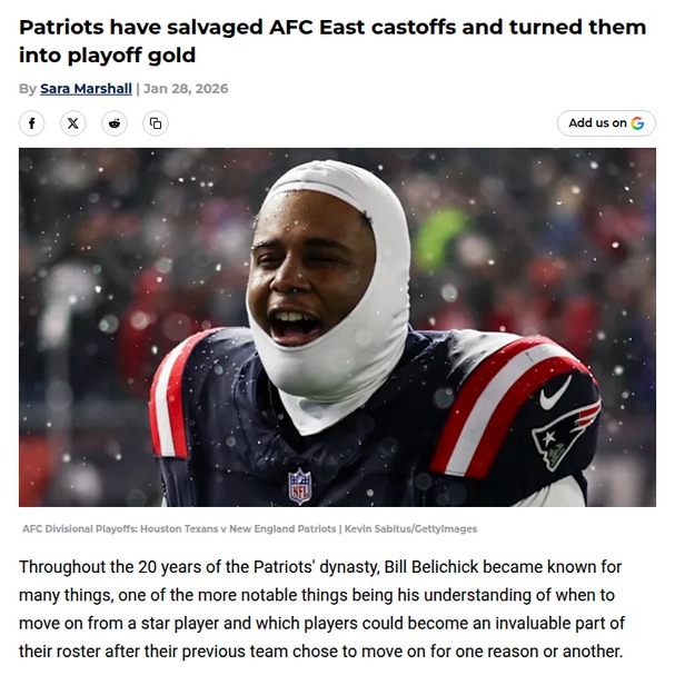 Chad Williams+FollowPatriots Strike Gold with AFC East CastoffsHow about the Hoodie’s magic rubbing off on Vrabel? The Pats are back in the spotlight thanks to some serious AFC East drama. Mack Hollins, let go by the Bills, is suddenly clutch in Foxborough, and Leonard Taylor III—remember when the Jets cut him?—just tipped a game-saving field goal in the playoffs. These guys were afterthoughts, now they’re playoff heroes. If you told me in September these two would be Super Bowl X-factors, I’d have laughed. Belichick’s legacy of finding hidden gems lives on! #Sports #Football #Patriots20Share