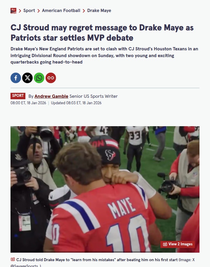 Jay Williams+FollowStroud vs Maye: AFC Rivals Set for ShowdownRemember when CJ Stroud gave rookie Drake Maye some encouragement after torching the Pats last season? Fast forward, and Maye’s not just bounced back—he’s now in the MVP conversation and just led New England to a playoff win. Meanwhile, Stroud’s Texans are still rolling, but he’s had his struggles. This rematch is more than a game—it’s a statement. Can Maye get revenge and prove he’s the new king in the AFC? #Sports #Football #Patriots00Share