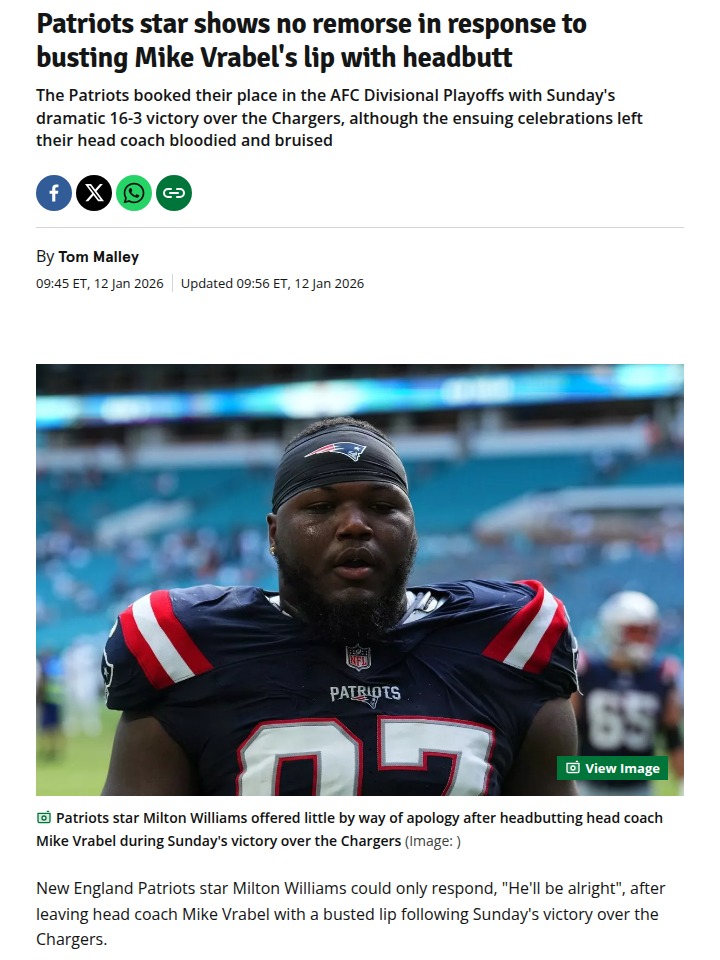 glen25+FollowPatriots wild win leaves Vrabel bloodied but laughingMilton Williams’ fired-up headbutt left Patriots coach Mike Vrabel with a busted lip—and Vrabel couldn’t have been prouder. After sealing the playoff win with a game-clinching sack, Williams’ helmet met Vrabel’s face in a sideline celebration gone wild. Vrabel shrugged off the blood, joking about “spilling some” in January, while Williams laughed it off, saying, “He’ll be alright.” This kind of raw emotion and camaraderie is what playoff football is all about. Do you think these intense moments bring teams closer, or is it just part of the game’s chaos? #Sports #Football #Patriots00Share