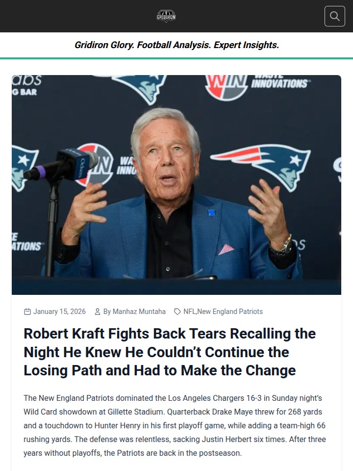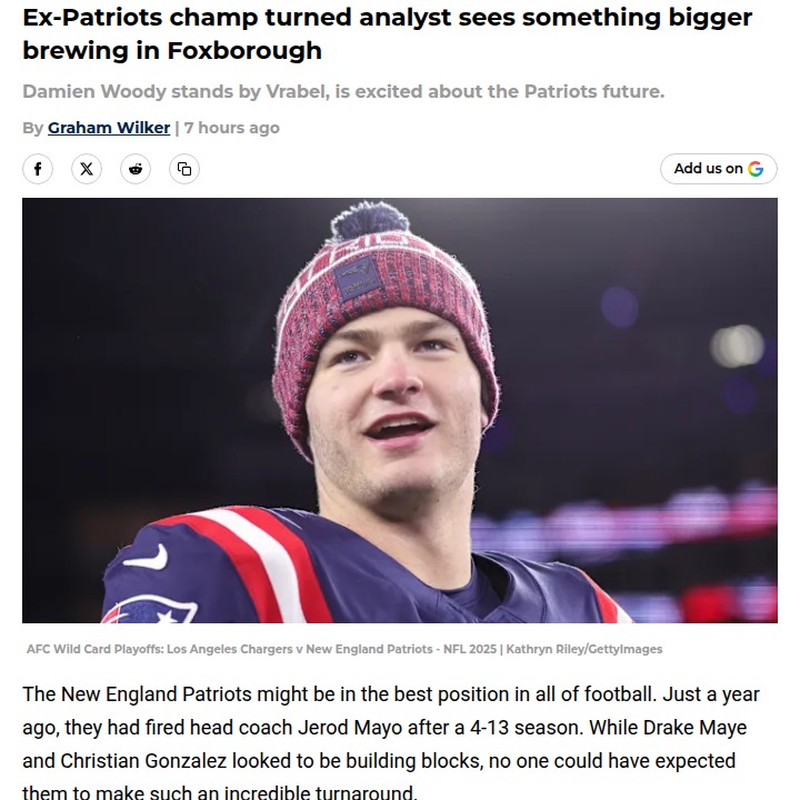 Michael Pitts+FollowKraft’s Bold Call Sparks Pats’ Playoff RevivalPats Nation, how about that turnaround? After years of heartbreak, Robert Kraft’s emotional decision to move on from Jerod Mayo—despite his legendary status—set the stage for a new era. The gamble on Vrabel and the rise of Drake Maye (already looking like a Foxborough legend) have the Patriots back in the hunt. That Wild Card domination of the Chargers? Just the beginning. Can this new-look squad keep the magic alive against Houston’s red-hot defense? Let’s talk! #Sports #Football #Patriots00Share