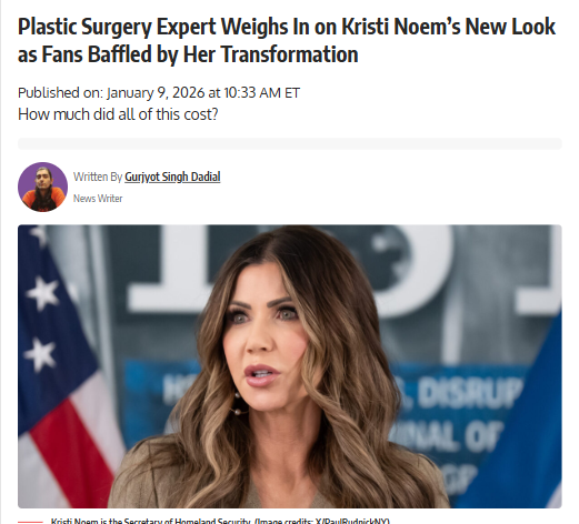 david80+FollowKristi Noem’s ‘Mar-a-Lago Face’ Glow-Up?Kristi Noem’s new look has everyone talking—did she get the full ‘Mar-a-Lago face’ package? A plastic surgeon broke down her likely treatments: think Botox, fillers, cheek implants, and even high-tech skin tightening. The price tag? Surprisingly not wild—maybe $1,500 to $6,000 total. Noem’s staying mum, but the internet is buzzing about her transformation and what it says about the new beauty playbook in politics. #Beauty #KristiNoem #PlasticSurgery20Share