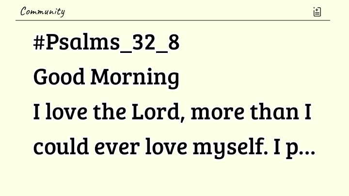 #Psalms_32_8 Good Morning I love the Lord, more than I could ever love myself. I put him first in all that I do. May God bless everyone that's here today, in Jesus name Amen