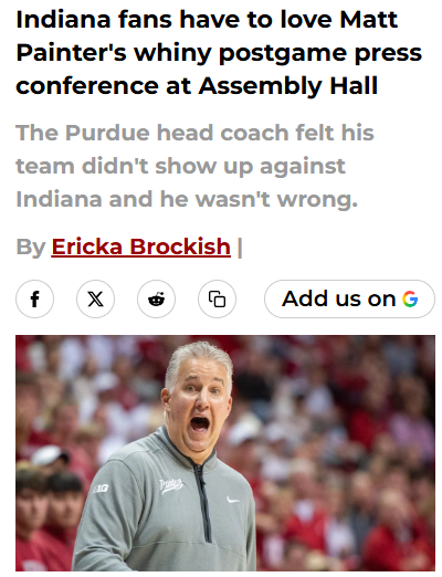 EchoingEagle+FollowIndiana stuns Purdue, Painter fumes at Assembly HallIndiana basketball fans just got the ultimate bragging rights—beating No. 12 Purdue at Assembly Hall, and with new football coach Curt Cignetti in the crowd, no less. The Hoosiers snapped their losing streak with back-to-back wins, but what really has everyone talking is Purdue coach Matt Painter’s heated postgame press conference. He called out his own team for lack of effort and only reluctantly gave IU credit. With Indiana winning the turnover battle and dominating at the free-throw line, it’s clear who wanted it more. How do you think this rivalry will shape the rest of the season? #Sports #IndianaHoosiers #Purdue00Share