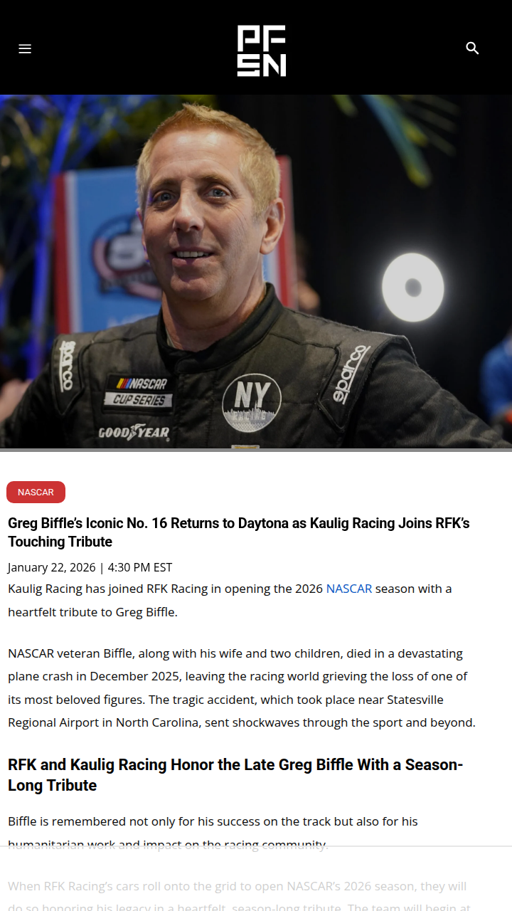 Karla Young+FollowRemembering The Biff: No. 16 Rides AgainRFK and Kaulig Racing are teaming up for a powerful tribute to The Biff—Greg Biffle—at Daytona this season. After the tragic loss of Biffle and his family, both teams will honor his legacy by bringing back his iconic No. 16 and signature number font. Seeing AJ Allmendinger wheel the tribute car at the Daytona 500 is sure to be an emotional moment for longtime fans. Thoughts on this classy move? #Sports #Racing #NASCAR00Share