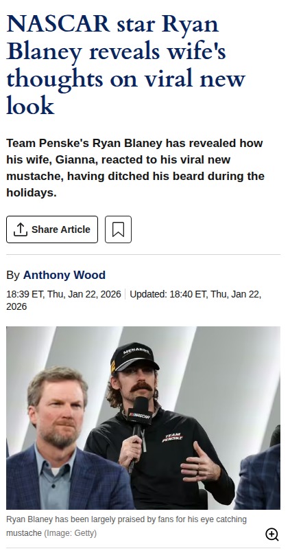 qglover+FollowBlaney’s ‘Earnhardt Stache’ Sparks NASCAR BuzzY’all catch Ryan Blaney’s new mustache? The Team Penske ace ditched his usual beard for a full-on ‘Earnhardt stache’ over the holidays, and fans can’t stop talking. Even Mrs. Blaney gave it the green light! Some say it’s a good luck charm as Blaney gears up for his first run at the Cup under NASCAR’s revived ‘Chase’ format. Could this legendary lip warmer help him bounce back after last season’s playoff heartbreak? Let’s hear your takes! #Sports #Racing #NASCAR10Share