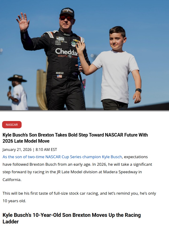 qglover+FollowBusch family racing legacy hits CaliforniaA 10-year-old is about to shake up California’s racing scene—Brexton Busch, son of NASCAR champ Kyle Busch, is jumping into the ultra-competitive JR Late Model division at Madera Speedway. He’s already racked up 23 wins and a national title, and now he’ll be taking on older teens in a car packing 350 horsepower. It’s wild to see someone so young with this much talent and support. Do you think Brexton’s early start gives him an edge, or is there more to racing than family legacy and sponsorships? Let’s hear your take on the next generation of NASCAR hopefuls! #Sports #Racing #NASCAR40Share