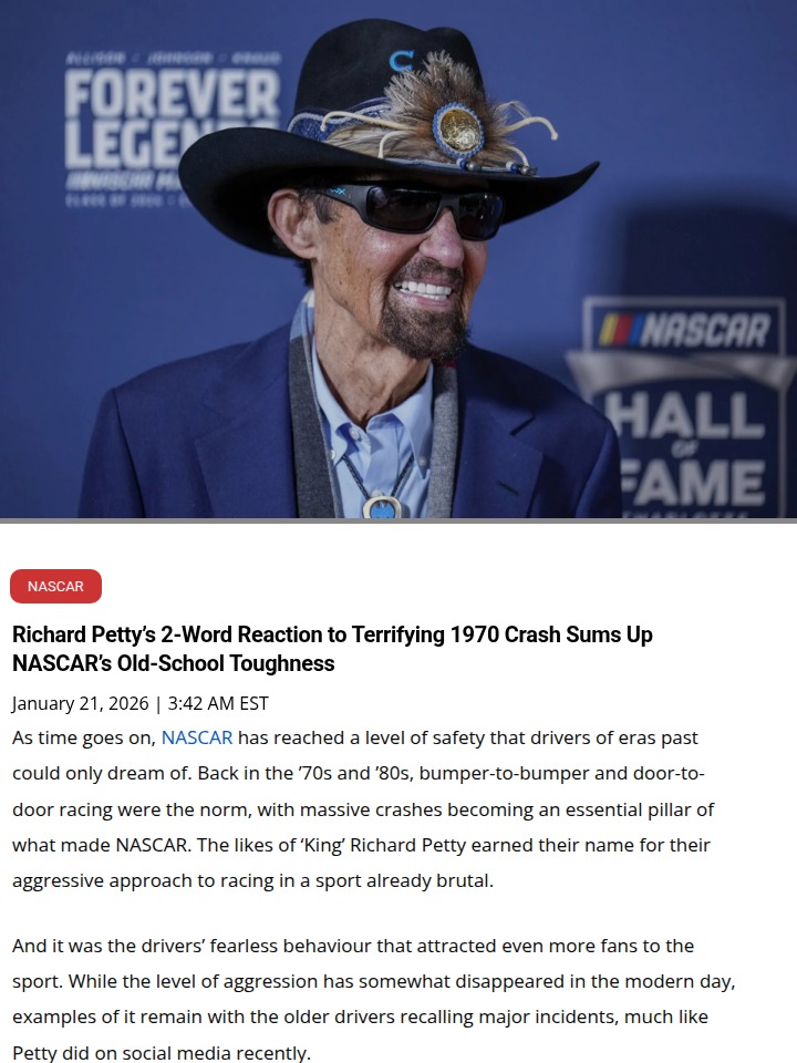 Roger Franco+FollowKing Petty’s Epic Crash: Old-School GritNothing sums up NASCAR’s old-school toughness like ‘The King’ Richard Petty walking away from that wild 1970 Rebel 400 crash. His two-word “Hey Y’all” post about the wreck just shows how fearless those legends were. Imagine flipping down the front stretch, body hanging out, and still finishing the season in the top 5! They don’t make ‘em like King Petty anymore. Thoughts on how today’s drivers would handle that kind of chaos? #Sports #Racing #NASCAR20Share
