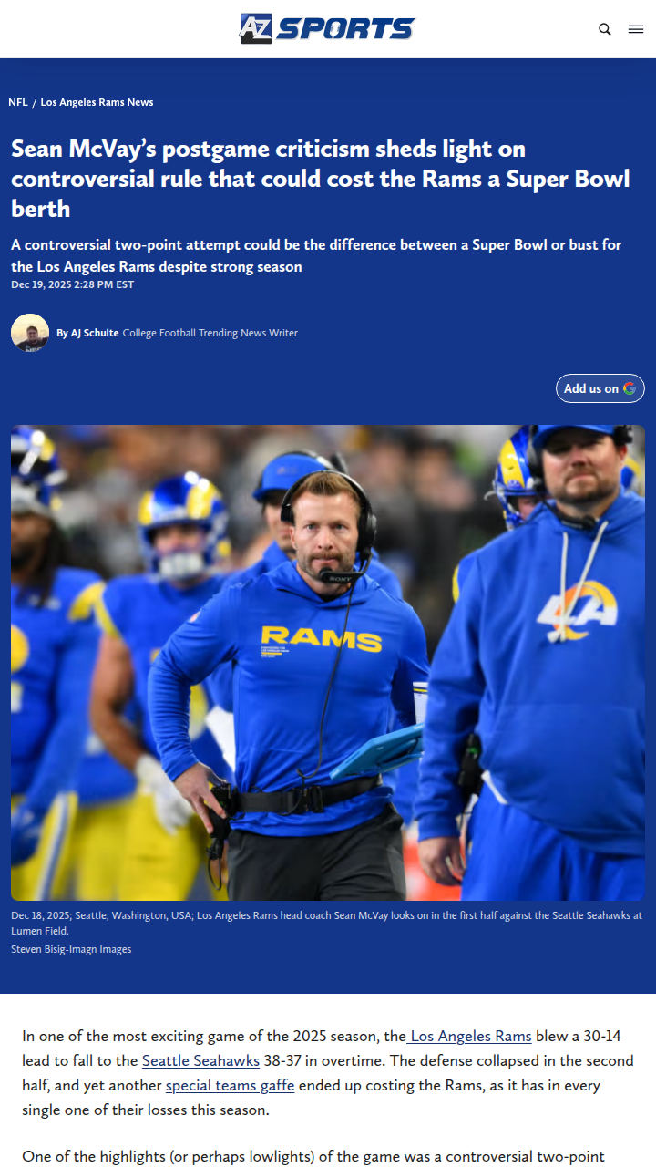 Aaron Taylor+FollowRams vs Seahawks: McVay Fumes Over 2-Point CallWow, Rams fans, that finish against the Seahawks was wild—and not in a good way. The Rams blew a big lead, but the real drama came on Seattle’s controversial two-point try. After the play was ruled incomplete, a review flipped it to a backwards pass and a live ball, letting the Seahawks tie it up. Coach McVay’s never seen anything like it, and honestly, neither have I. Do you think the refs got it right, or did the Rams get robbed? #Sports #Football #RamsNation00Share