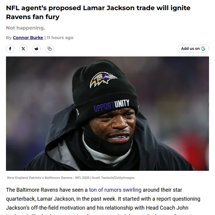 Jay Williams+FollowRavens fans react to wild Lamar Jackson trade rumorTrading away Lamar Jackson for an unproven rookie? That’s the latest buzz swirling around Baltimore, and it’s got Ravens fans fired up. An NFL agent floated the idea of sending Jackson to the Vikings in exchange for J.J. McCarthy and draft picks—a move that would shake up the entire franchise. Even with Jackson’s recent injuries, most agree you don’t just let a two-time MVP walk, especially for a QB still finding his footing. With Jackson set to start against the Steelers and contract talks looming, this debate isn’t going away soon. What do you think—should the Ravens even consider this? #Sports #Football #RavensFlock01Share