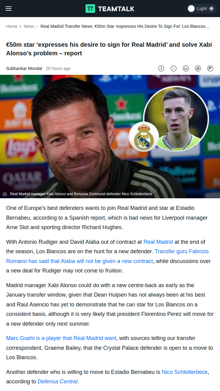 Tara Moran+FollowSchlotterbeck Eyes Bernabeu Move—Bad News for RedsBig news for Los Blancos fans: Dortmund’s Nico Schlotterbeck reportedly wants to join Real Madrid, aiming to solve Xabi Alonso’s defensive headache as Alaba and Rüdiger’s futures hang in the balance. With Liverpool also in the hunt for the German international, this transfer saga could heat up the rivalry between the Spanish giants and the Reds. Will Schlotterbeck be the next star at the Bernabeu? #Sports #Soccer #RealMadrid00Share