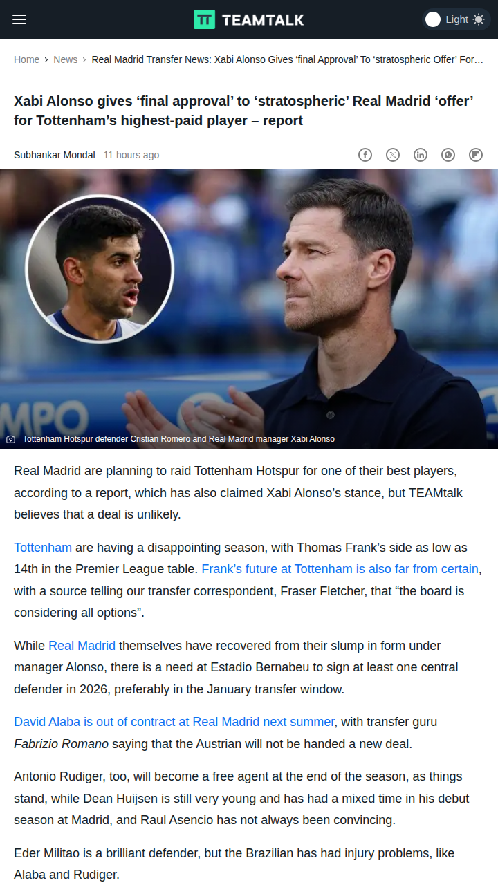 Allison Travis+FollowMadrid Eyes Spurs’ Romero in Transfer SagaLooks like Los Blancos are circling Spurs’ defensive rock, Cuti Romero, with Xabi Alonso reportedly giving the green light for a massive bid. While Real’s backline is in flux with Alaba and Rudiger possibly leaving, Madrid fans are buzzing about this potential Premier League raid. But insiders say a January move is a long shot, especially with Romero just signing a new deal. Is this just transfer smoke, or could Cuti really swap North London for the Bernabeu? #Sports #Soccer #RealMadrid00Share