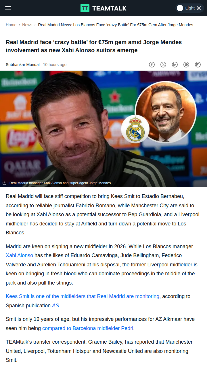 Jillian Morse+FollowLos Blancos Face Wild Kees Smit Bidding WarInsiders are buzzing: Real Madrid are gearing up for a fierce battle to land AZ Alkmaar’s 19-year-old midfield sensation, Kees Smit. With super-agent Jorge Mendes in the mix and Premier League giants circling, the price tag could hit €75m. Smit’s being compared to Pedri, and Los Blancos want him to be their next midfield maestro. Will Florentino Perez outmaneuver the English clubs? This summer’s transfer window could get wild! #Sports #Soccer #RealMadrid00Share
