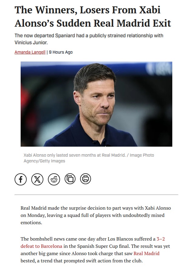 Malik Williams+FollowMadrid Sacks Xabi Alonso After Barça BlowWow, what a shocker! After Los Blancos’ 3-2 Supercopa loss to their eternal rivals Barça, Real Madrid have parted ways with club legend Xabi Alonso. The Maestro’s tenure lasted just seven months, and his post-match comments downplaying the trophy didn’t sit well with Perez and the board. With King Klopp’s Liverpool still on the lookout, could we see Alonso back at Anfield? Let’s discuss! #Sports #Soccer #RealMadrid00Share