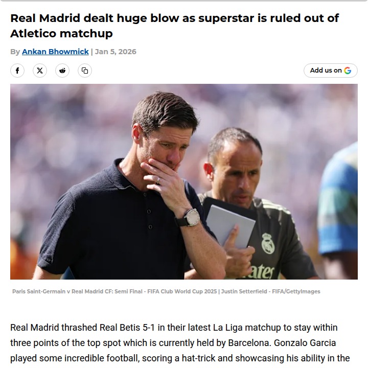 Jamie Mack+FollowMbappé Out: Madrid Derby Just Got TougherTough news for Los Blancos fans—King Kylian is likely out for the Super Cup semi against Atleti after missing the Betis rout. Gonzalo Garcia’s hat-trick was electric, but can the youngster deliver again in a high-stakes Madrid Derby? Last time, Atleti put five past us. With revenge on the line and Mbappé’s status uncertain, it’s all eyes on Alonso’s tactics and Garcia’s nerve. Can Madrid step up and flip the script? #Sports #Soccer #RealMadrid00Share