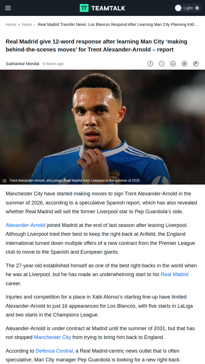 Allison Travis+FollowMadrid Shuts Down Man City’s Trent Move RumorSo, the latest buzz has Pep and the Cityzens sniffing around for Trent Alexander-Arnold, but Los Blancos aren’t having any of it. Madrid’s response? A flat-out refusal to sell their English star for €40M. Even though TAA’s start in Spain hasn’t been electric, Madrid’s not letting a player of his class go on the cheap—especially not to a Premier League rival. Do you think City will up their bid, or is this just transfer gossip? #Sports #Soccer #RealMadrid10Share