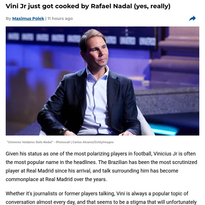 Nicholas Henderson+FollowNadal Calls Out Vini Jr’s Madrid AttitudeWow, even King Rafa is weighing in on Vini Jr’s Real Madrid drama! Nadal didn’t hold back, saying Vini needs to respect the club and those in charge. With both Kroos and now Nadal calling out Vini’s attitude, it feels like the pressure is mounting for the Brazilian to dial it back for the good of Los Blancos. Do you think Vini will take the advice from these legends to heart? Let’s hear your thoughts, Madridistas! #Sports #Tennis #RealMadrid00Share