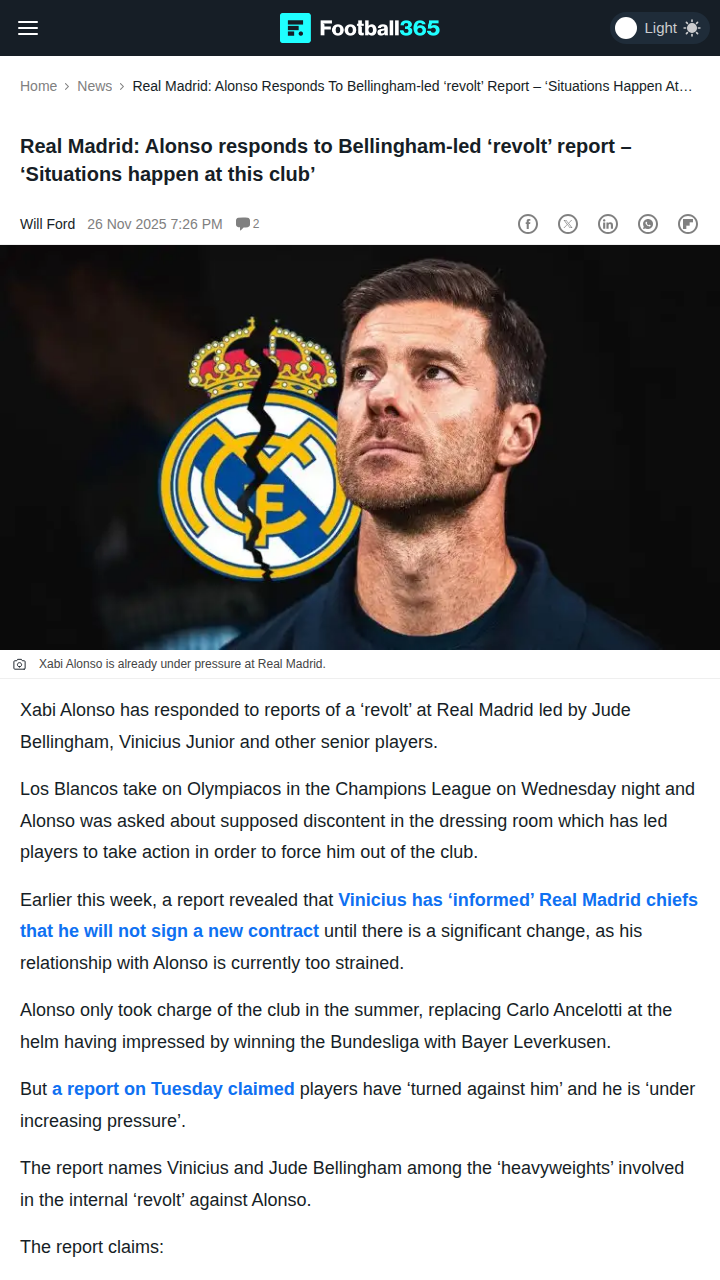 Jillian Morse+FollowOlympiacos vs Real Madrid: Dressing Room Drama?Los Blancos fans, what do you make of the latest buzz around Xabi Alonso and the supposed 'revolt' led by Bellingham and Vini Jr.? With the Champions League clash against Olympiacos looming, reports claim some heavyweights are unhappy with Alonso’s approach. Alonso insists it’s just part of life at Madrid, but with Vini allegedly refusing to renew his contract, could this internal tension spill onto the pitch? Let’s hear your thoughts on whether this is just media noise or a real threat to our UCL run. #Sports #Soccer #RealMadrid00Share