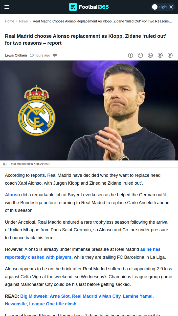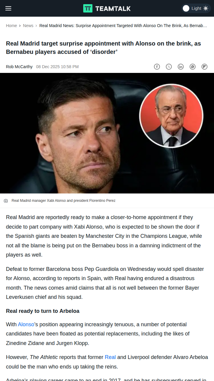 Tara Moran+FollowReal Madrid’s Alonso Crisis: Arbeloa Next?Los Blancos fans, things are heating up at the Bernabeu! After that tough 2-0 loss to Celta Vigo, Xabi Alonso’s seat is getting hotter, with the board holding late-night crisis talks. The must-win Champions League showdown with Man City could decide his fate. Rumor has it, if Alonso goes, ex-Liverpool and Madrid man Alvaro Arbeloa—now impressing with the reserves—might get the nod over legends like Zidane or Klopp. Would you back Arbeloa to steady the ship? #Sports #Soccer #RealMadrid00Share