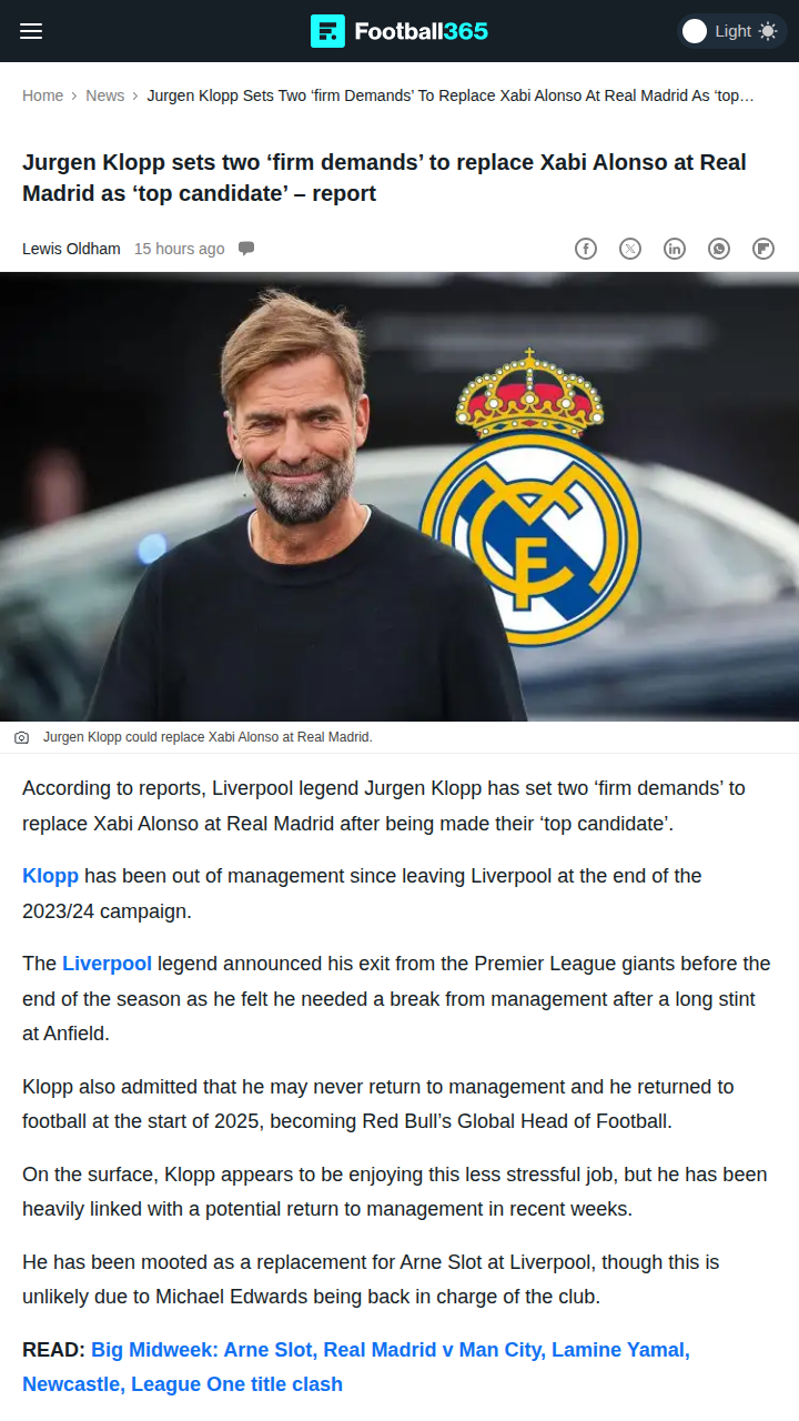 Maurice Miller+FollowKlopp’s Shock Real Madrid DemandsRumors are swirling in Madrid! King Klopp is reportedly Real’s top pick to replace Xabi Alonso after that tough 2-0 loss to Celta Vigo. But here’s the twist: Klopp wants a major shakeup, allegedly insisting Vinicius Jr. and Rodrygo must go for him to take the job. With Los Blancos under pressure in both La Liga and the Champions League, could we see a Klopp-led revolution at the Bernabéu? #Sports #Soccer #RealMadrid00Share