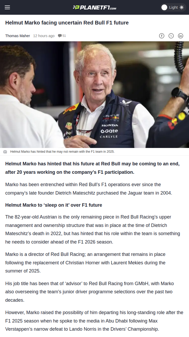 Jeremy Campbell+FollowMarko’s Red Bull Era Nears Finish Line?Longtime Red Bull mastermind Helmut Marko is hinting at stepping away after two decades shaping the Bulls’ F1 destiny. With the team’s upper management already shaken up and new faces like Mekies and Mintzlaff calling the shots, Marko’s future looks more uncertain than ever. The tension reportedly peaked after his comments post-Verstappen vs. Norris championship battle. Could this be the end of an era for the Doctor and Red Bull? What’s your take on who should fill his shoes if he bows out? #Sports #Racing #RedBullRacing10Share