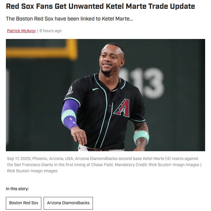 Maria Chavez+FollowRed Sox Miss Out on Marte—What’s Next?Looks like the dream of seeing Ketel Marte in a Red Sox uniform is fading fast. D-backs GM Mike Hazen basically shut down the trade talk, saying they want to focus elsewhere this offseason. With Boston already missing out on big bats like Pete Alonso and Schwarber, the options are thinning. Could Alex Bregman be the next target? Sox fans, what’s your take—should the front office get more aggressive before the market dries up? #Sports #Baseball #RedSox00Share