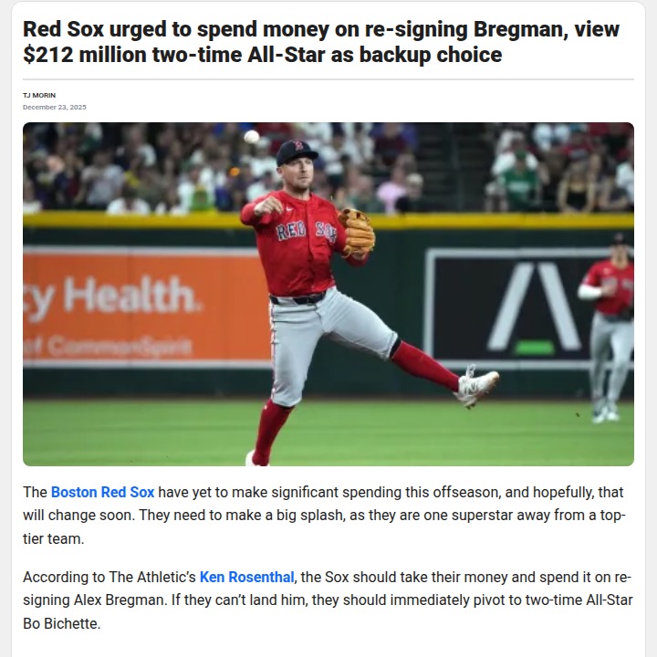Timothy Huff MD+FollowRed Sox Eye Bregman Before Okamoto DeadlineInsider Jon Heyman just dropped a bomb: the Red Sox are leading the chase for Alex Bregman, with a decision expected before Kazuma Okamoto’s posting window closes Jan. 2. With both Bregman and Okamoto on the market, teams like the Blue Jays and D-backs are waiting for the dominoes to fall. If Boston lands the three-time All-Star early, it could be a game-changer for the hot corner. Will the Sox finally make their move, or will another contender swoop in? #Sports #Baseball #RedSox01Share